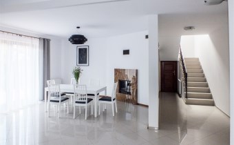 Dom zlokalizowany jest w spokojnej okolicy z luźną zabudową jednorodzinną, w otoczeniu łąk, lasu i rzeki. Dojazd drogą asfaltową, teren płaski, ogrodzony. Od frontu elegancki mur z kamienia i drewna. Brama wjazdowa oraz drzwi garażowe sterowane pilotem.