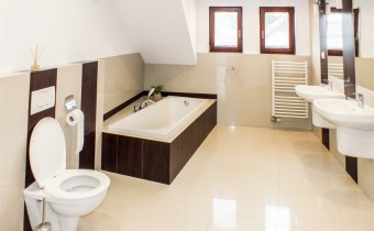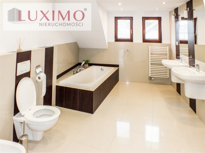 • duża łazienka z wanną, prysznicem, bidetem, dwiema umywalkami i oknem,