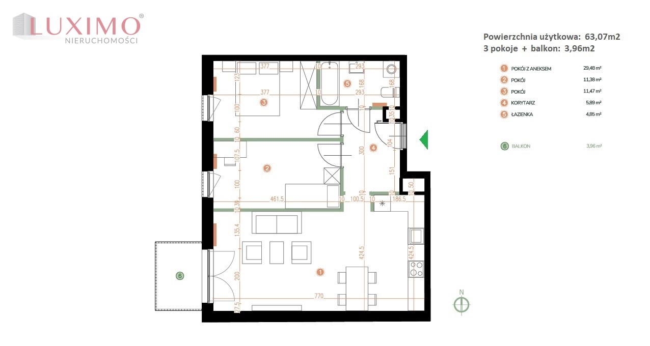 Składa się z: przestronnego salonu z aneksem kuchennym (29,48m2), 2 sypialni (11,47m2 i 11,38m2), łazienki (4,85m2) i przedpokoju (5,89m2).