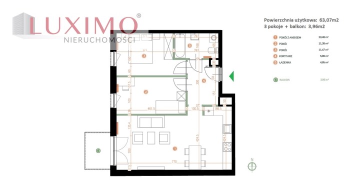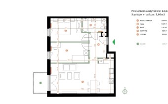 Mieszkanie o powierzchni 63,07m2 z balkonem o pow. 3,96m2, usytuowane na 1 piętrze w nowoczesnym budynku z 2026r. z cichobieżną windą