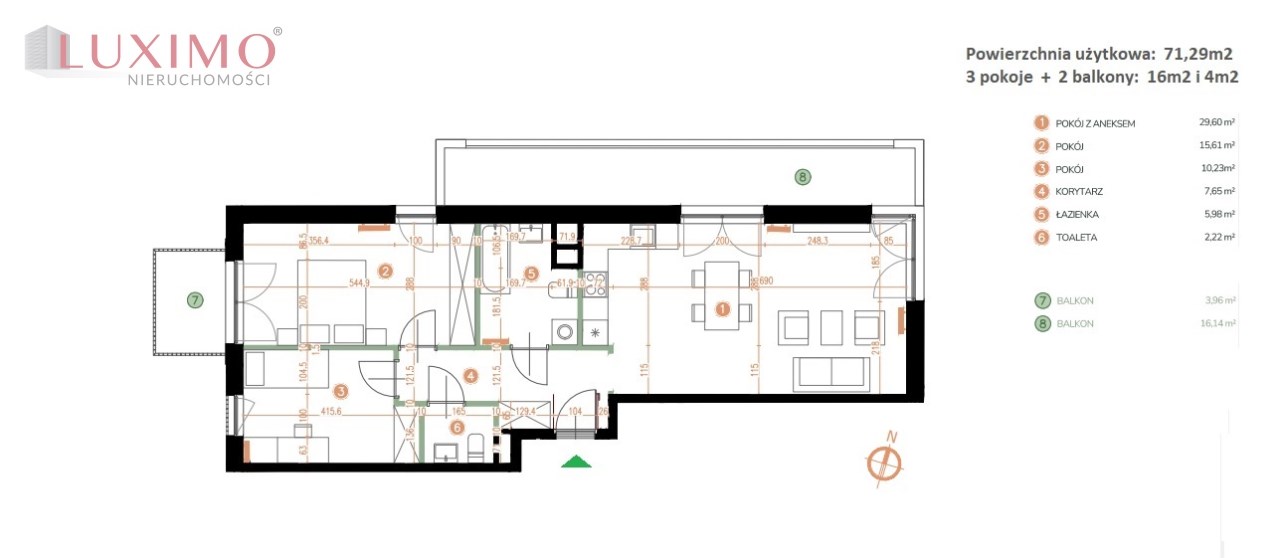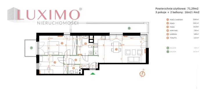 Mieszkanie o powierzchni 71,29m2 z dwoma balkonami o pow. 16m2 i 4m2, usytuowane na 1 piętrze w nowoczesnym kameralnym budynku z cichobieżną windą.