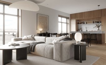 Składa się z: ustawnego salonu z aneksem kuchennym (26,81m2), sypialni (13,48m2), 2 pokoi (9,05m2 i 8,40m2) 2 łazienek (5,49m2 i 3,17m2) oraz przedpokoju (12,43m2).