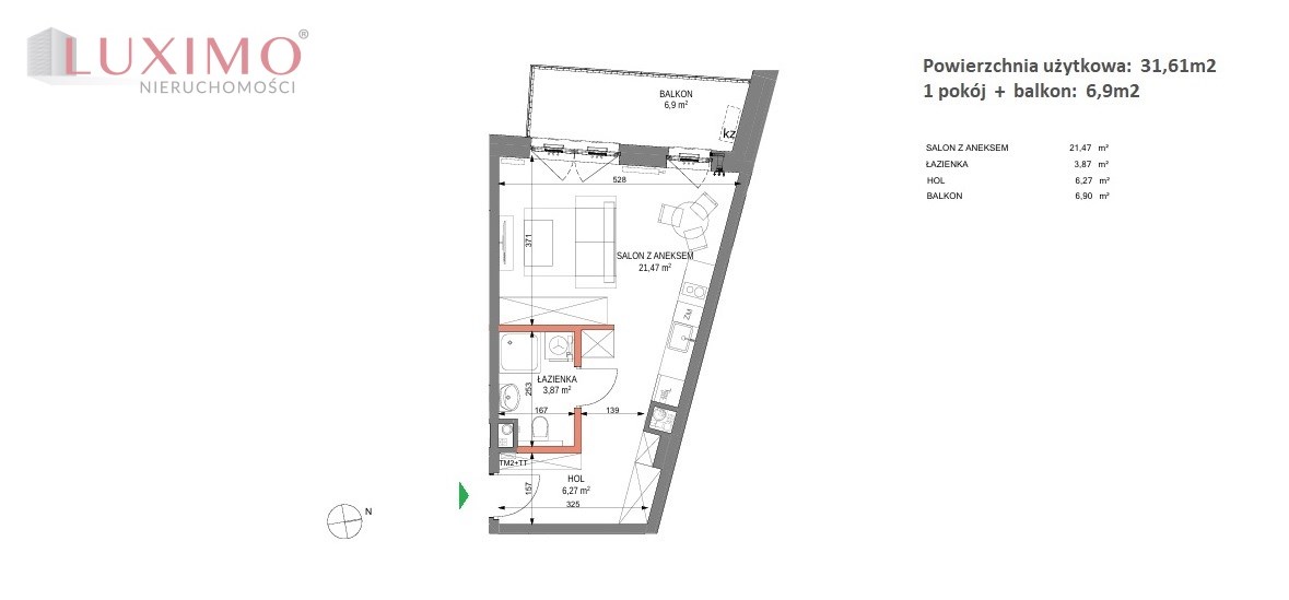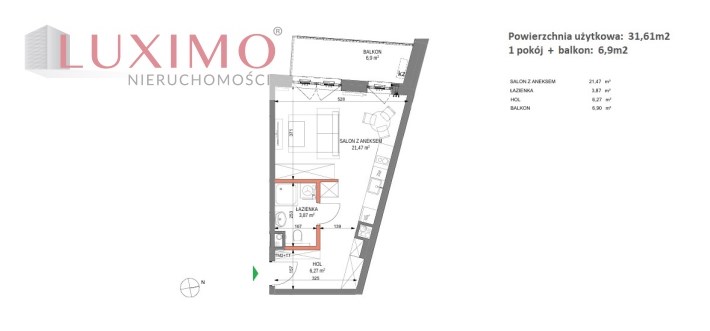 Mieszkanie o powierzchni 31,61m2 z balkonem o pow. 6,9m2, usytuowane na 1 piętrze w nowoczesnym kameralnym budynku z cichobieżną windą.