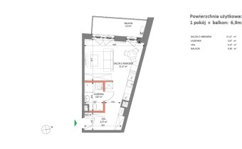Składa się z: salonu z aneksem kuchennym (21,47m2), łazienki (3,87m2) oraz holu (6,27m2).
