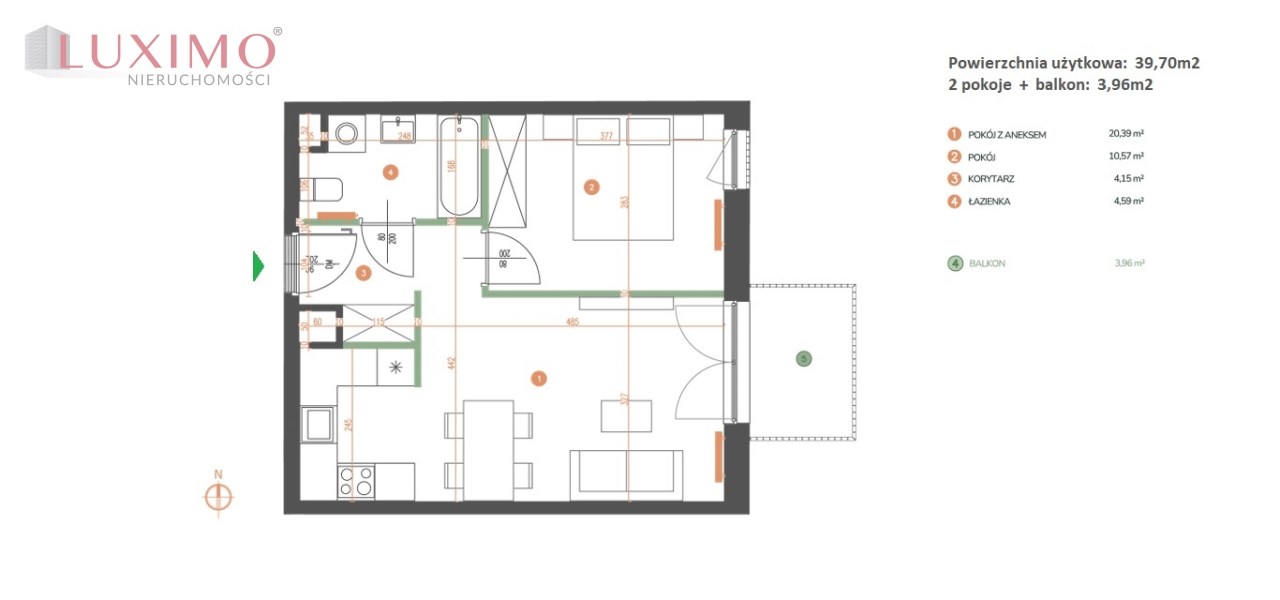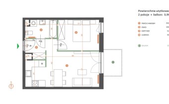 Składa się z: pokoju dziennego z aneksem kuchennym (20,39m2), sypialni (10,57m2) łazienki (4,59m2) i przedpokoju (4,15m2).
