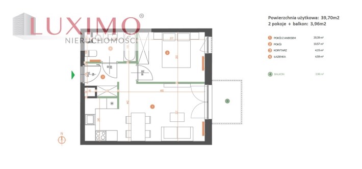 Mieszkanie o powierzchni 39,70m2 z balkonem o pow. 3,96m2, usytuowane na 1 piętrze w nowoczesnym kameralnym budynku z 2025r. z cichobieżną windą.