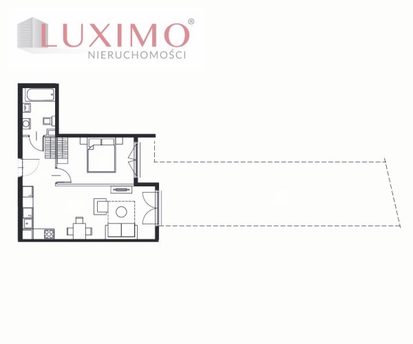 Pokój z aneksem kuchennym, ( 21,98 m²), sypialnia ( 11,56 m²), łazienka (4,71 m²), przedpokój ( 5,08 m²), ogród ( 50,64 m²).