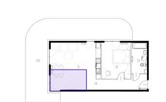 - salonu połączonego z aneksem kuchennym - powierzchnia 32m2 - układ okien umożliwia wydzielenie sypialni na rzucie oznaczony kolorem