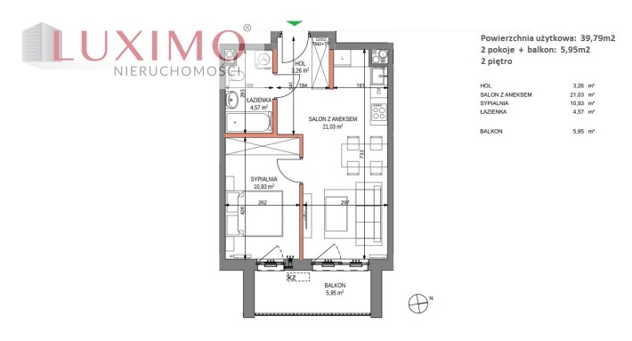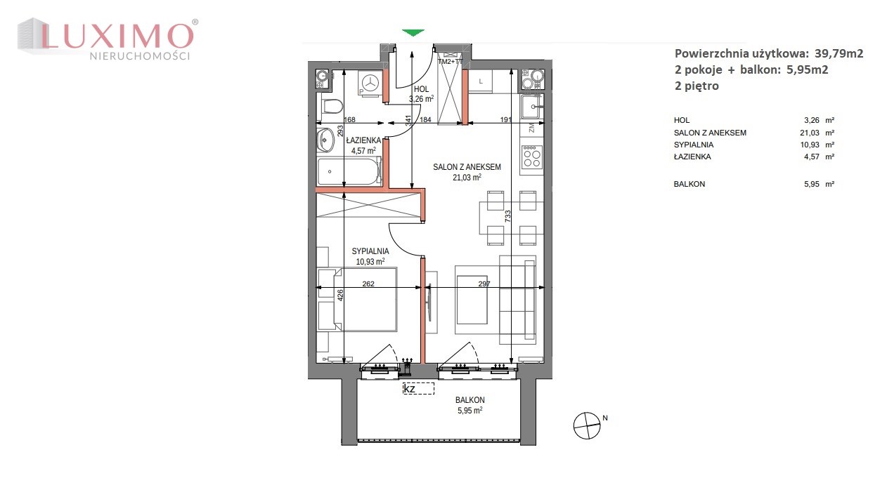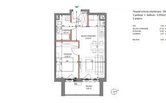 Składa się z: salonu z aneksem kuchennym (21,03m2), sypialni (10,93m2), łazienki (4,57m2) oraz holu (3,26m2).