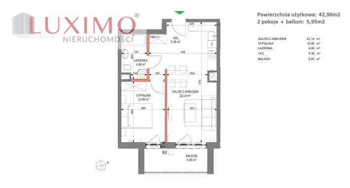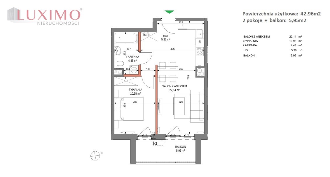 Składa się z: salonu z aneksem kuchennym (22,14m2), sypialni (10,98m2), łazienki (4,48m2) oraz holu (5,36m2). Możliwość oddzielenia kuchni.
