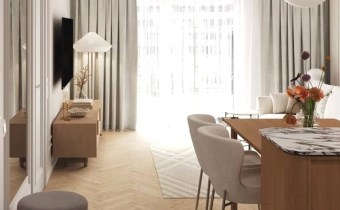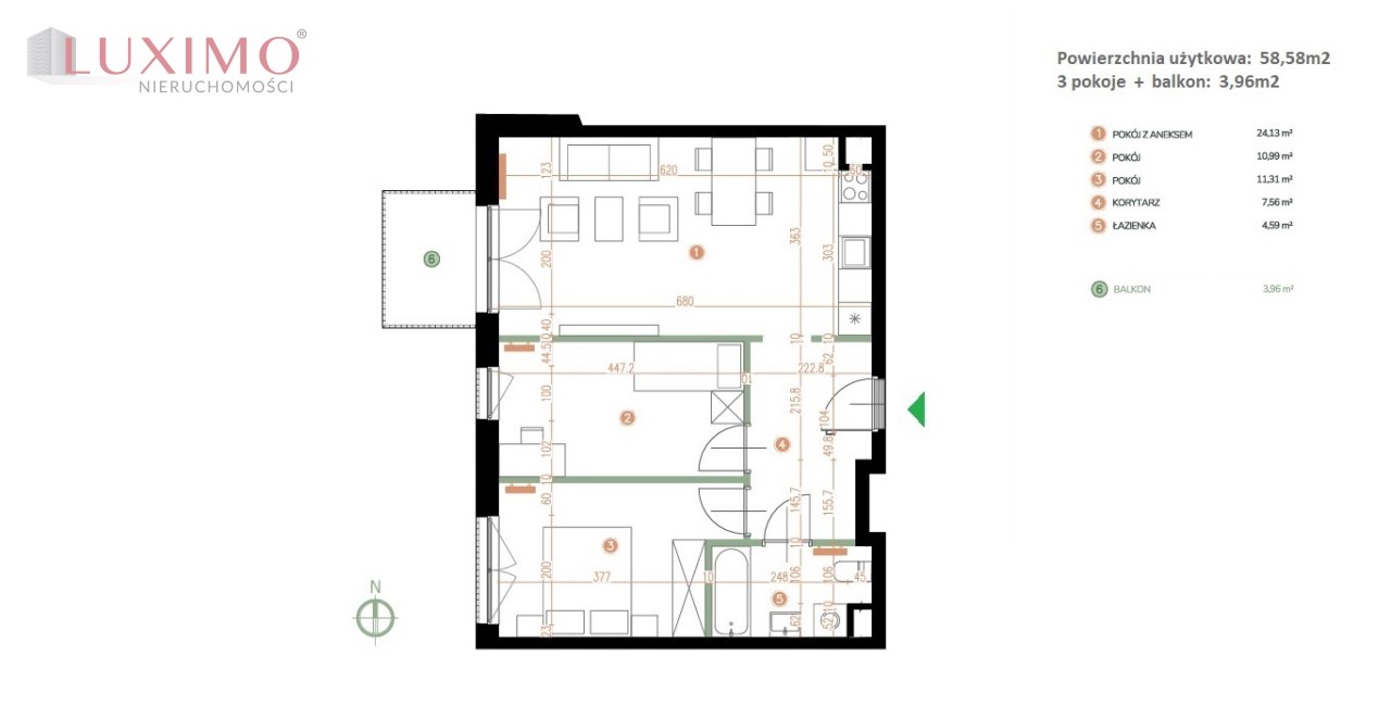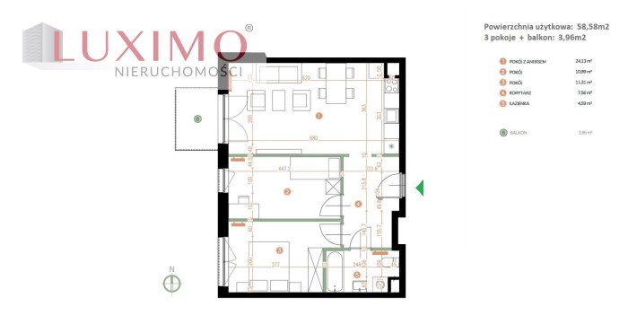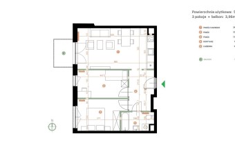 Składa się z: przestronnego salonu z aneksem kuchennym (24,13m2), 2 sypialni (11,31m2 i 11m2), łazienki (4,59m2) i przedpokoju (7,56m2).