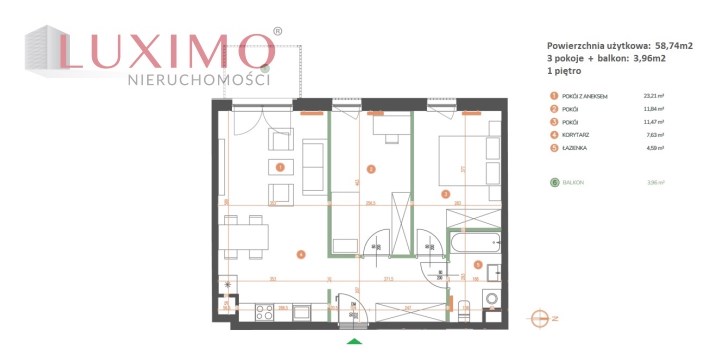 Mieszkanie o powierzchni 58,74m2 z balkonem o pow. 3,96m2, usytuowane na 1 piętrze w nowoczesnym kameralnym budynku z 2025r. z cichobieżną windą.