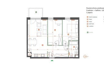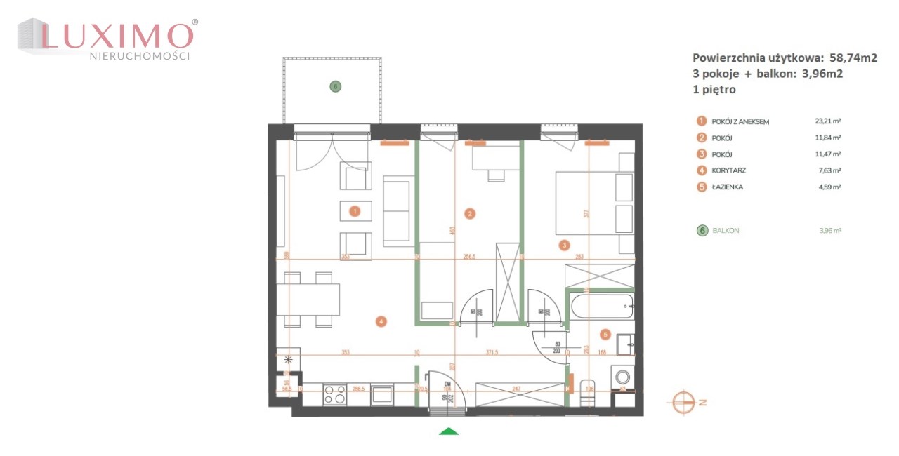 Mieszkanie o powierzchni 58,74m2 z balkonem o pow. 3,96m2, usytuowane na 1 piętrze w nowoczesnym kameralnym budynku z 2025r. z cichobieżną windą.