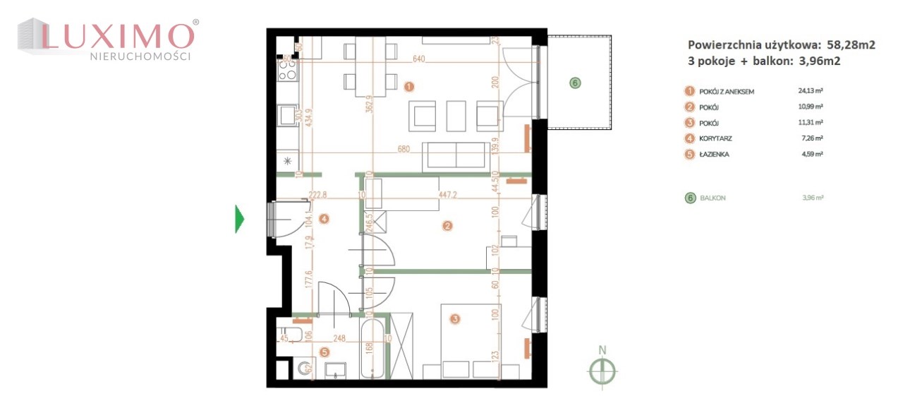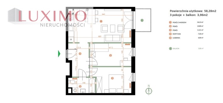 Powierzchnia użytkowa 58,28 m²