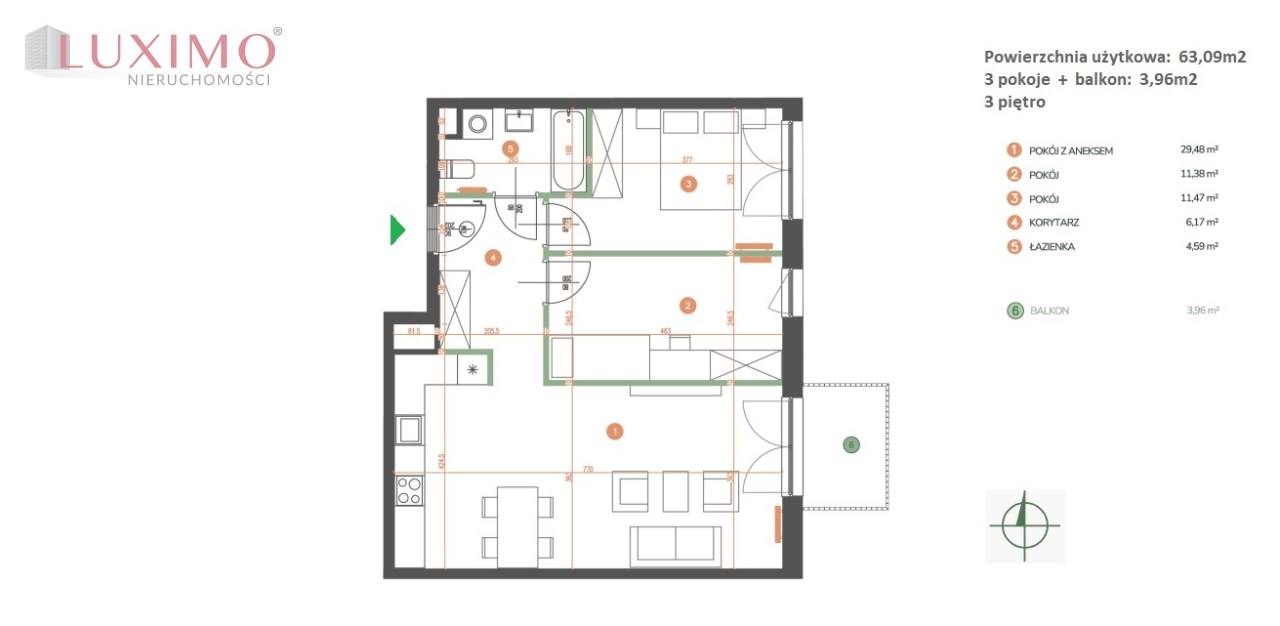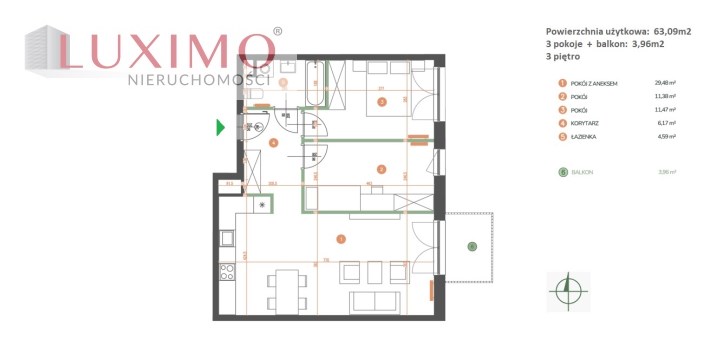 Mieszkanie o powierzchni 63,09m2 z balkonem o pow. 3,96m2, usytuowane na 3 piętrze w nowoczesnym budynku z 2025r. z cichobieżną windą.