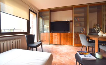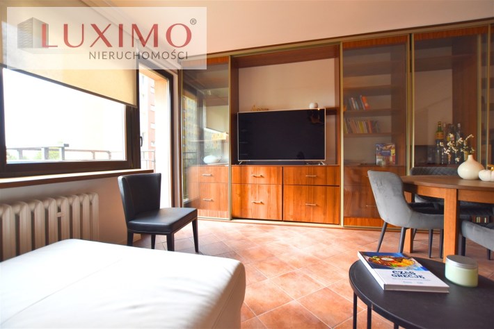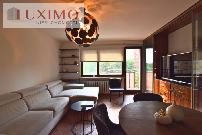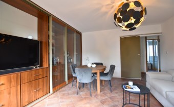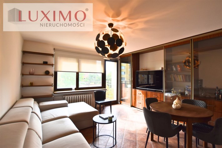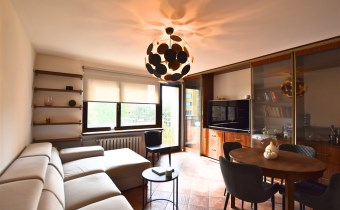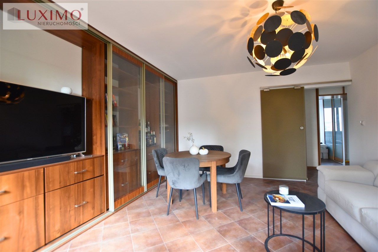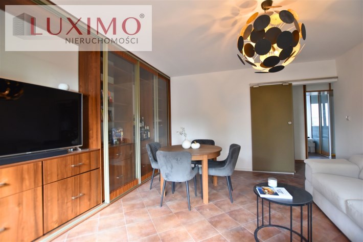 - przestronny salon z wyjściem na balkon, rozkładanym narożnikiem, stołem z krzesłami i ciekawą zabudową meblową ze szklanymi witrynami