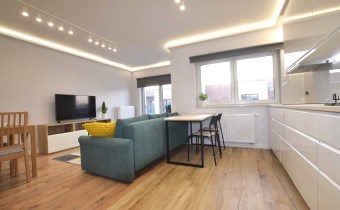Przestronny salon z aneksem kuchennym (27m2) w pełni umeblowany i wyposażony w niezbędny sprzęt AGD (piekarnik, płyta grzewcza, zmywarka, lodówko-zamrażarka), stół i 2 krzesła.