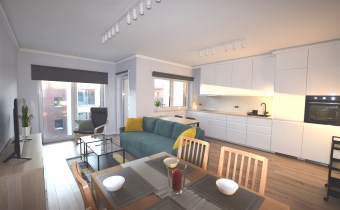 Przestronny salon z aneksem kuchennym (27m2) w pełni umeblowany i wyposażony w niezbędny sprzęt AGD (piekarnik, płyta grzewcza, zmywarka, lodówko-zamrażarka), stół i 2 krzesła.