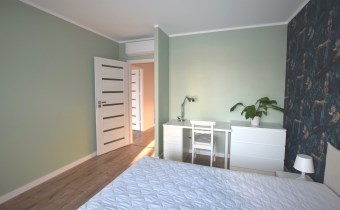2 duże sypialnie (13,5m2 i 12m2), w większej sypialni duże łóżko dwuosobowe z materacem, biurko z krzesłem i komoda. W mniejszej sypialni - możliwość doposażenia w zależności od preferencji.
